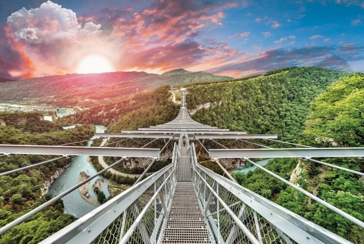 Вы увидите ущелье и протекающее по нему реку, горы и море вдали, также тропинку, пробегающую в другую сторону по ущелью по направлению к Красной поляне, а выше располагаются вершины Главного Кавказского хребта. Стоить уточнить, что мост в Скай Парке является самым протяжённым в мире подвесным мостом. Он располагается на огромной высоте – более 200 метров, и длиной в полкилометра. Называется он Skybridg и входит в комплекс развлечения этого парка.